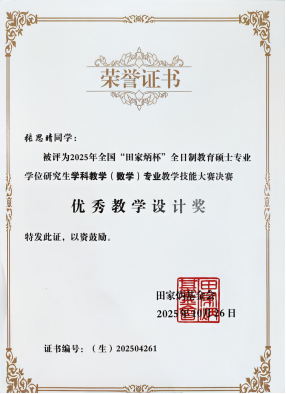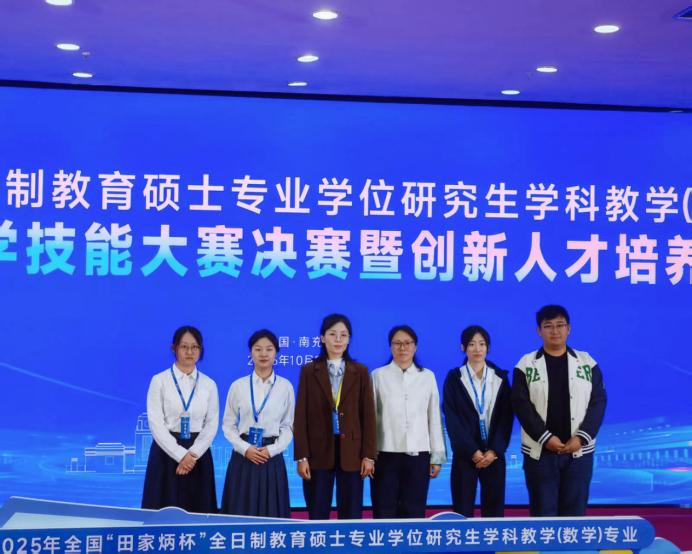 10月25日至26日,2025年全国“田家炳杯”全日制教育硕士专业学位研究生学科教学(数学)专业教学技能大赛决赛成绩出炉,我院2024级学科教学(数学)专业硕士研究生张书悦获得三等奖,张思晴、刘昕梦、樊一霖同学获得决赛优秀教学设计奖。